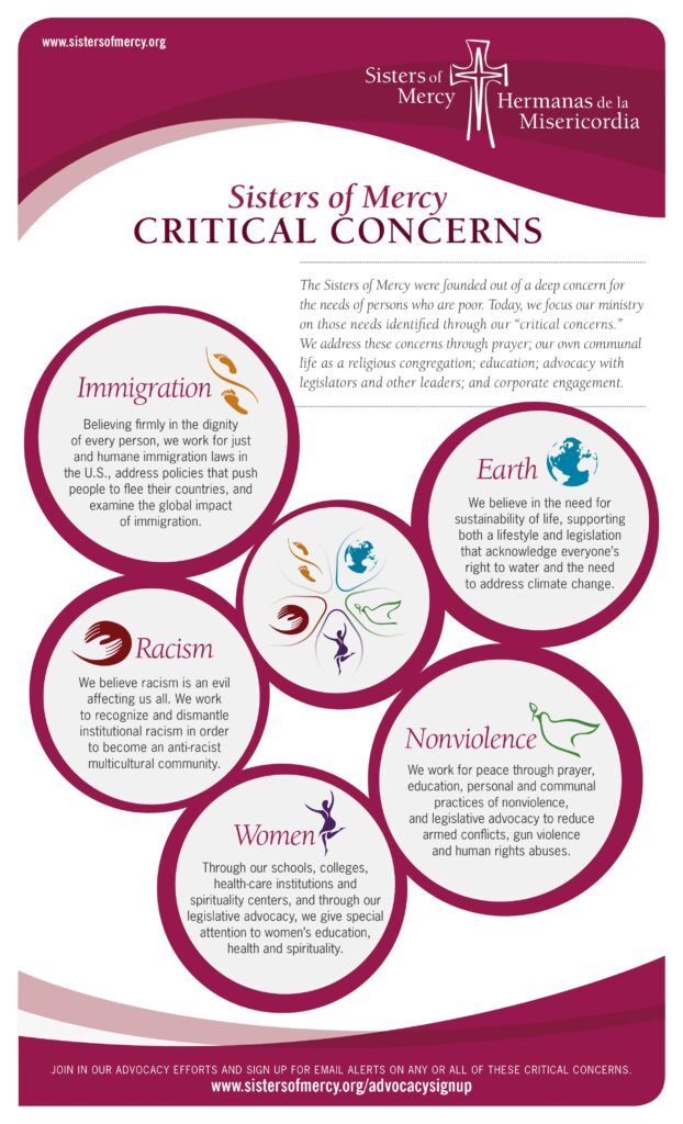 But we’re not just growing vegetables—we’re growing Mercy and care for the Earth too! The Earth is just one of five critical concerns of the Sisters of Mercy, which together are racism, nonviolence, women, immigration, and the environment. Check out this infographic (right) which explains how the Sisters are taking on these issues!