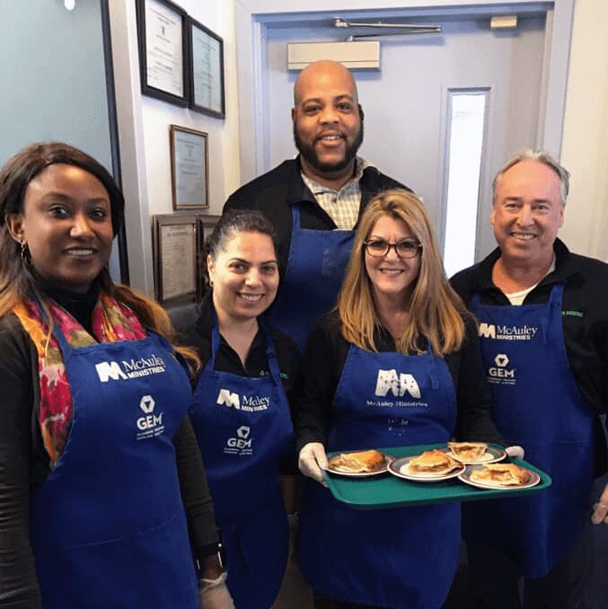 McAuley Ministries launched “Lunch on Us” in 2007 in partnership with community leaders who value the employee engagement experience when teams serve the guest of McAuley House. These corporate sponsorships combined provide for the costs of serving healthy food and a welcoming community to 200+ people each day Monday – Friday. Each month features a corporate sponsor whose employees come to serve lunch each day and receive gratitude from those we serve.