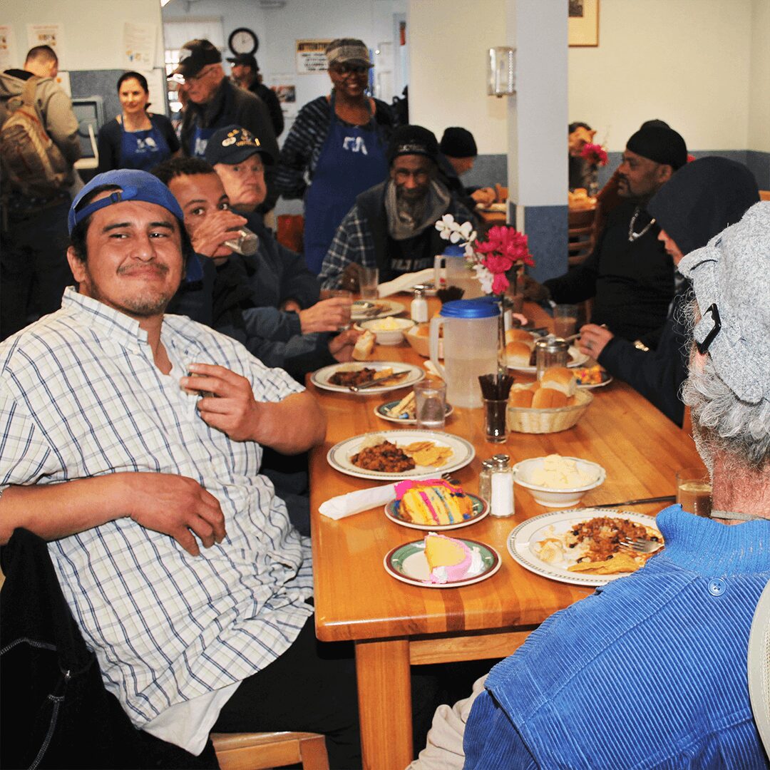 After a daily prayer of thanksgiving, guests are served lunch “restaurant-style,” one plate at a time. Our chef prepares lunch with creativity and care, using nourishing ingredients of donated and purchased foods. Volunteers plate the food, serve the meals, pour beverages, and provide a selection of desserts. Volunteers then clean the area and make room for more guests to sit and enjoy their meal.